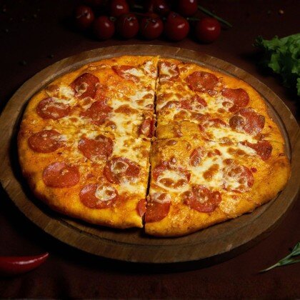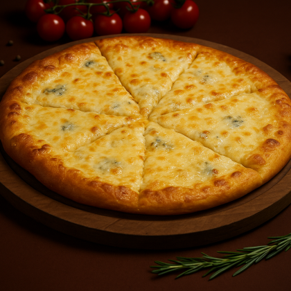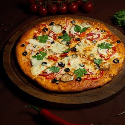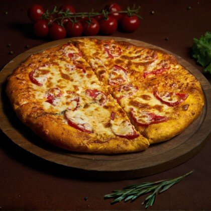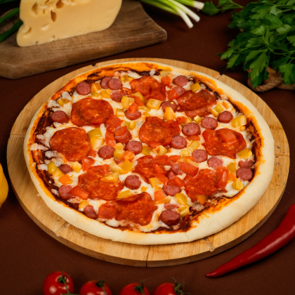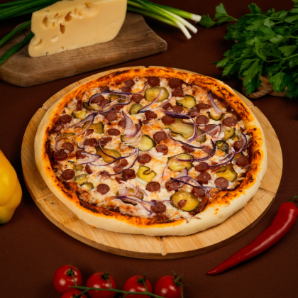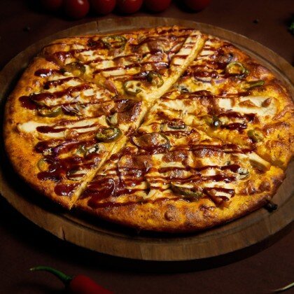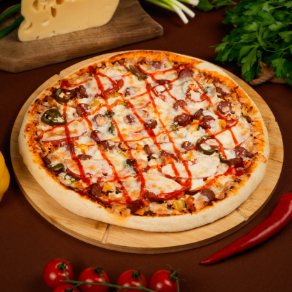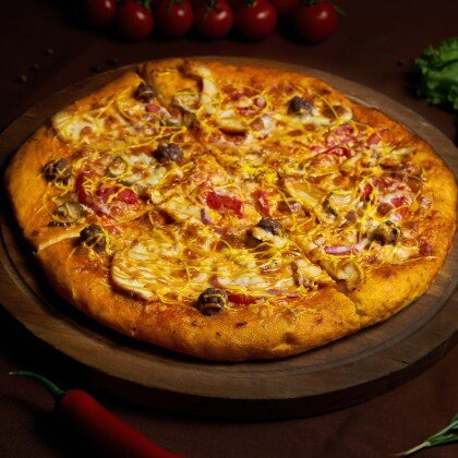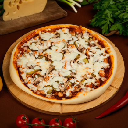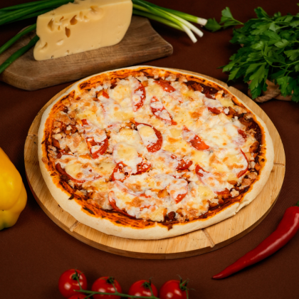 Моцарелла, пармезан, курица, помидор, бекон, соус чесночный, соус фирменный томатный, тесто